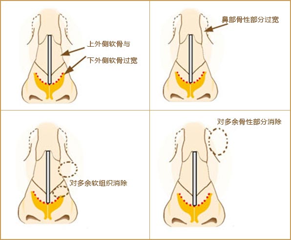 宽大的鼻梁给人厚重、笨拙的感觉,且面部失去柔和美。需要@@对具体的宽鼻情况,进行@@对性矫正。