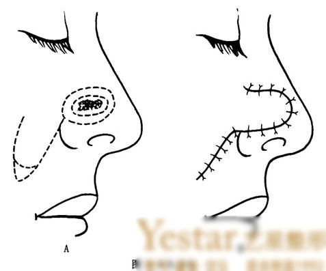 1、切除缺损处的疤痕并将其下部剖开,向下翻入鼻腔,可作为部分衬里,同时达到扩大组织接触面的目的,使移植片容易存活。