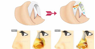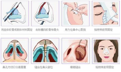 2、 鼻孔外进路:鼻孔外进路全鼻整容术,此法先在鼻中柱的中1/3与下1/3的交界处及鼻翼软骨的内侧脚和外侧脚的前缘做一鼻孔边缘切口,通过皮肤切口,将外鼻的皮肤向上掀起,直至鼻骨的下缘,切开骨膜并通过骨膜切口将鼻骨的与其表面的骨膜、肌肉和皮肤分离,进而在直视下完成鼻背驼峰截除、鼻背缩窄和鼻背下部的改造。鼻孔外进路法适合于我国大多数人的鼻整容。无论哪种鼻整容方法,在手术结束后应做鼻腔内填塞、鼻外部夹板固定。