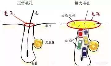 健康的毛孔是下图左边这个样子滴——毛孔口无“杂物”堵塞,孔口较窄小。