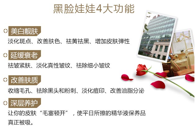 “黑脸娃娃紫衣人”是大S《美容大王2》中极力推荐的美容项目。在台湾又叫“黑炭娃娃”、“柔肤镭射”。黑脸娃娃以其显著的效果和、无需恢复等特点,深受爱美人士的喜爱。黑脸娃娃其实就是一种美白嫩肤的方法。
