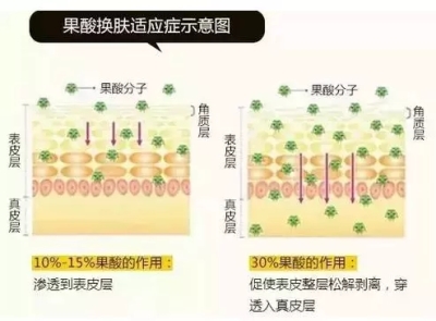 果酸换肤果酸焕肤,即使用高浓度的果酸进行皮肤角质的剥离作用,促使老化角质层脱落,加速角质及少部分上层表皮的更新速度,促进真皮层内弹性纤维增生,以达到祛痘疤痘印、美白淡斑、提亮肤色、改善鸡皮肤、抗衰、增强皮肤抵抗力的作用,一次焕肤,多重受益。