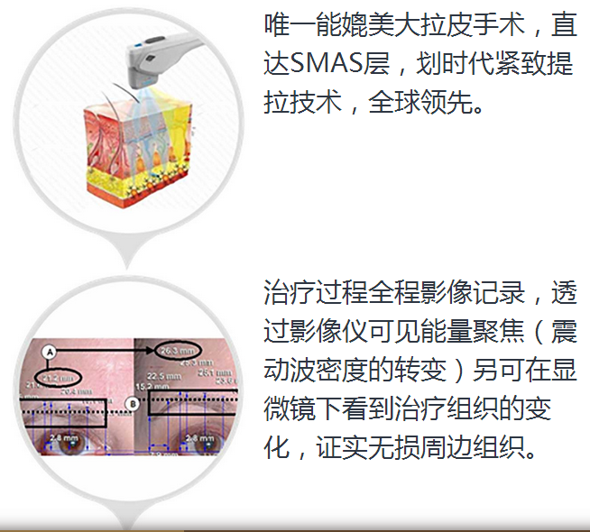 治疗深度为3.0-4.5mm,可直至更深的SMAS层,SMAS层正是手术拉皮治疗的重要拉提关键,因此突破了以往的限制,是能以非侵入式方法治疗SMAS的仪器。