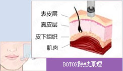 BOTOX除皱原理:通过阻断神经与肌肉的神经冲动,适度抑制、收缩肌肉作用的神经,从而起到减弱肌肉力量,消除皱纹的作用。