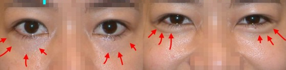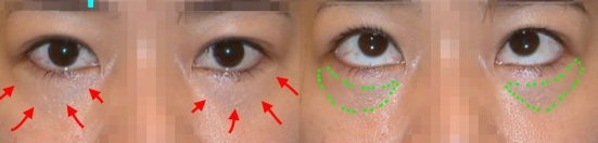 左图:红颜色箭头所指之处,就是残存的眼袋脂肪。 右图:眼睛向上看时,凸显出残存的下眼袋脂肪,如绿色记号范围。