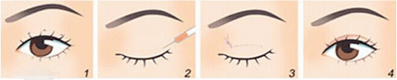 部分麻醉后,医生切开皮肤及眼轮匝肌,用眼科小镊伸入切口,夹住少许眼轮匝肌,提到切口外剪除。恰当向上、下、左、右挪动此点位置,寻觅能构成重睑的理想形态之处,再用甲紫在此处做小标志点,画好中 1/3 处长 2.5 毫米切口标志线。再以有齿镊深化切口寻觅眶隔脂肪,左手指在眼睑皮肤上按压,找到后翻开眶隔,剪破眶隔阂,将脂肪认真剪除,完整止血,行三点或两点埋线,停止包扎,直到手术完毕。