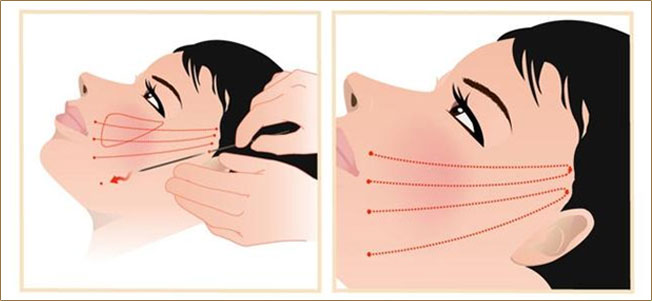 选择人体耳后上方头发内的隐秘部位,根据面部下垂程度选择提拉线数量由上而下埋入,提拉线种植完成整体拉紧,可达到整体提拉面部肌肤、呈现年轻状态的效果。