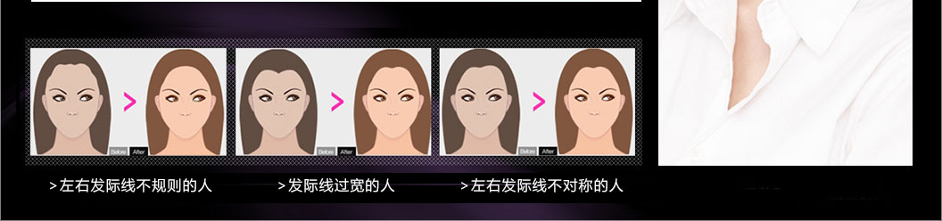 设计时,根据顾客年龄、脸型及密度,按照三庭五眼的设计标准、时尚设计理念,设计发际线和头发的生长方向。