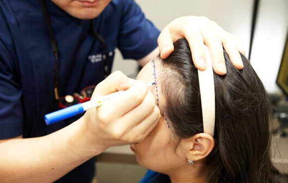 设计时,根据顾客年龄、脸型及密度,按照三庭五眼的设计标准、时尚设计理念,设计发际线和头发的生长方向。